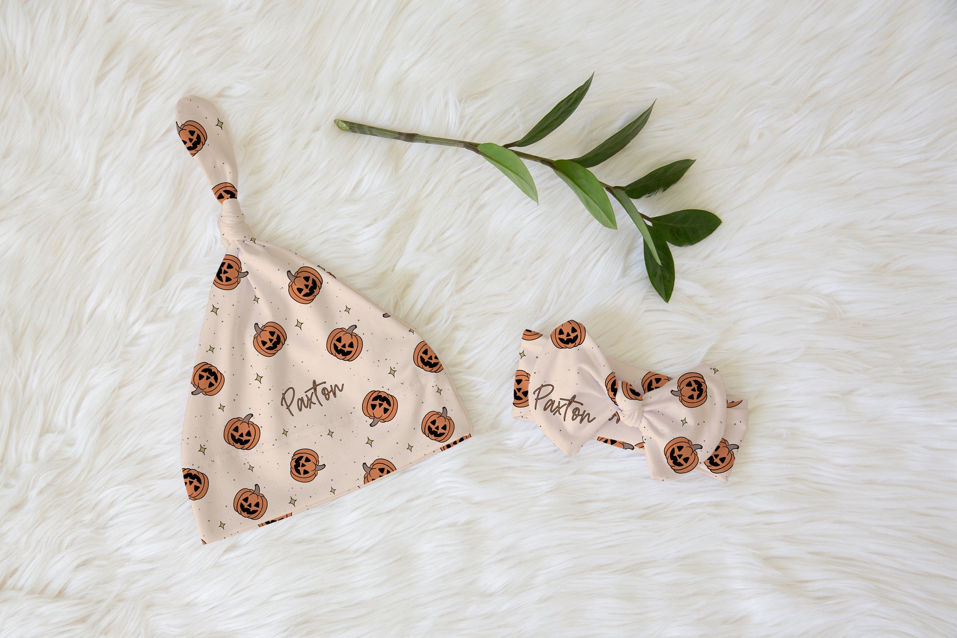 Pumpkin Halloween Personalized Knotted Newborn Hat & Bow Headband